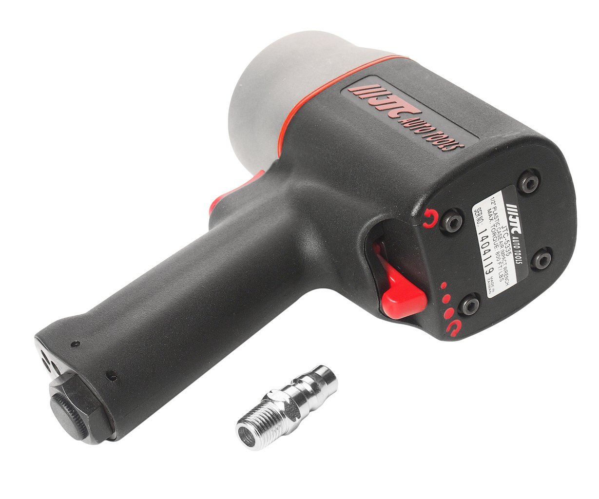 Ударный усиленный пневмогайковерт JTC 5335 выполнен в легком и прочном пластиковом корпусе. Инструмент длиной 17 см не вызывает неудобств при работе в ограниченном пространстве. Выступ рукояти препятствует выскальзыванию пневмогайковерта из рук в ходе эксплуатации. Высокий крутящий момент дает возможность плотно затягивать болты большого размера.