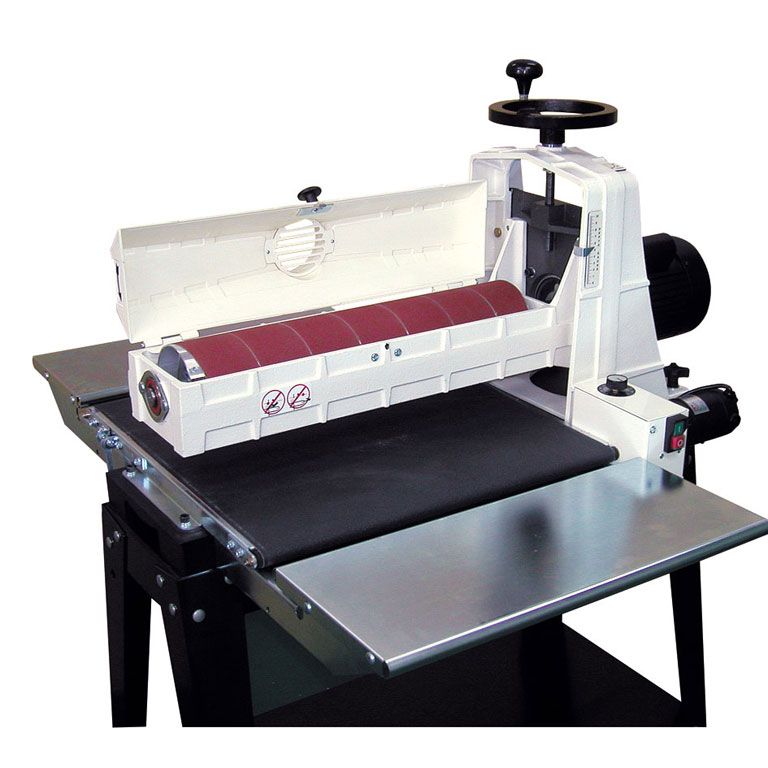 Предусмотрены все необходимые настройки: высоты установки барабана (маховиком сверху) и скорости подачи (плавная при помощи электроники). Центровка ленты транспортера производится специальными винтами и обычно требуется только после замены. Основной расходный материал – абразивная лента шириной 75 мм, она наматывается на барабан, концы фиксируются в зажимах.
