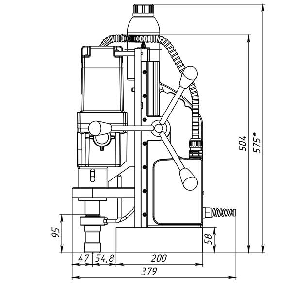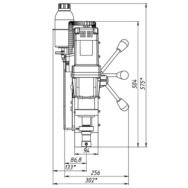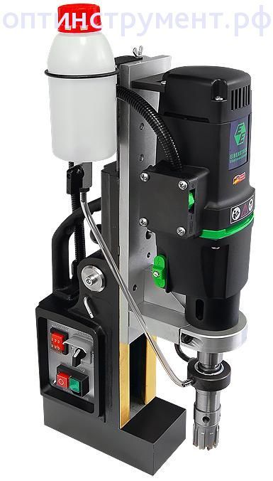 Предназначен для промышленного использования, сверления большого количества отверстий диаметром до 100 мм., также будет надежен при использовании спиральных сверл диаметром до 32 мм. Нарезка глухой резьбы возможна без специальных резьбонарезных патронов. В механизме электропривода, кроме проскальзывающей муфты, реализована схема контроля вращающего момента. Требуемый момент (он подбирается опытным путем) выставляется на регулировочной шкале, и, как только сила тока через обмотку двигателя достигнет заданной величины, мотор мгновенно остановится. На практике, система безошибочно срабатывает при нарезании резьбы метчиками от М8, а также предотвращает заклинивание и перегрузку двигателя при нарезке резьбы метчиками до М30.