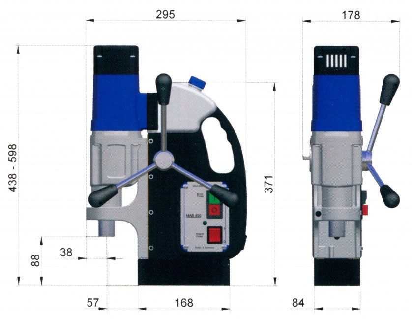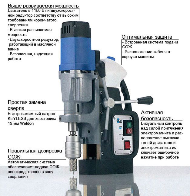 Магнитный сверлильный станок MAB 485 SB с поворотным механизмом, который дает возможность поворота магнитного основания до 20º относительно вертикальной оси в обе стороны и до 15 мм по длине для точного позиционирования. МАВ 455 – высокофункциональный сверлильный станок на магнитном основании для корончатого сверления диаметром до 40 мм и нарезания резьбы до М16.