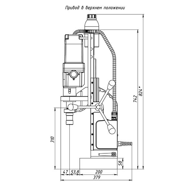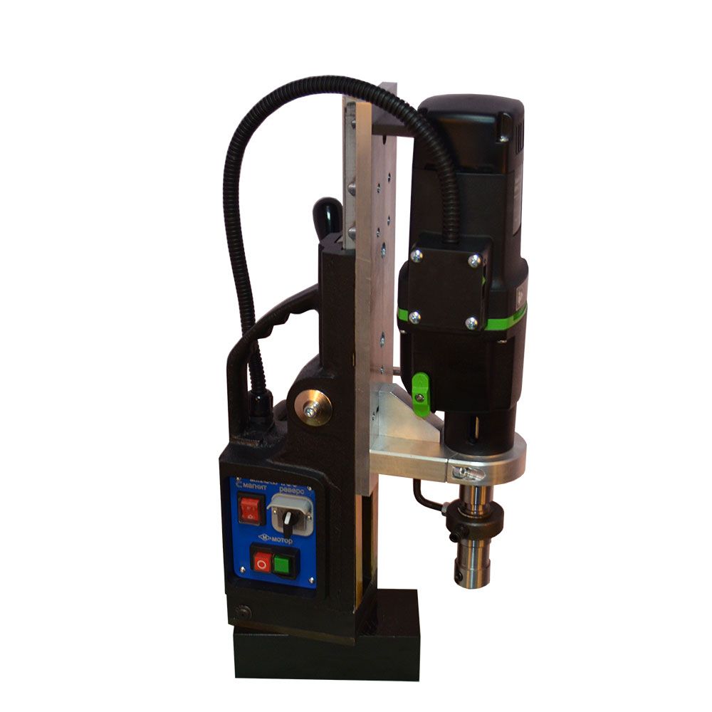 Предназначен для промышленного использования, сверления большого количества отверстий диаметром до 100 мм., также будет надежен при использовании спиральных сверл диаметром до 32 мм. Нарезка глухой резьбы возможна без специальных резьбонарезных патронов. Подвижное основание относительно магнита. Это станок с подвижным магнитным основанием, то есть при активированном электромагните возможно разъединить жесткую связь станины с магнитом и отрегулировать положение центра сверла, потом снова жестко закрепить станок поворотом рукоятки. Эта функция весьма полезна при сверлении вертикальных поверхностей, потому что трудно с первой попытки попасть довольно тяжелым магнитым станком в центр будущего отверстия. На магнитных станках зарубежных производителей такая функция называется "магнитное основание с юстировкой".