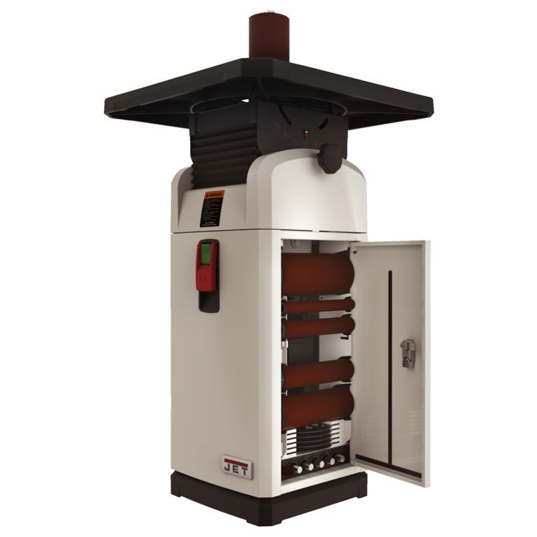 Стандартная комплектация включает в себя 10 шлифовальных шпинделей с диаметром от 6 до 100 миллиметров, а также кольцевые вставки в рабочий стол с круглым и овальным отверстием (для работы в наклонном положении стола). Расходный материал – абразивные гильзы – предлагаются со склада Jet в широком ассортименте.