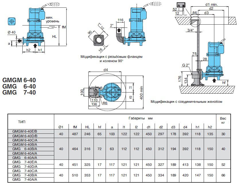 Насосные агрегаты типа GMG - погружные с открытым многолопастным рабочим колесом и блоком измельчения на всасывании. Проточная часть насоса, рабочие колеса выполнены из чугуна; блок измельчения - из нержавеющей стали AISI 440.
