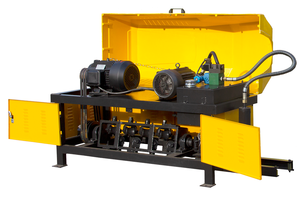 На станке ПРО-14 Компакт электродвигатель через шкив и ремни передает вращение на выпрямляющую раму. Рама одновременно выполняет функции подачи и выпрямления арматуры. Выпрямление происходит за счет давления обкатных роликов на арматуру. Резку осуществляет нож при помощи гидропривода, давление в гидроприводе создается масляным насосом.