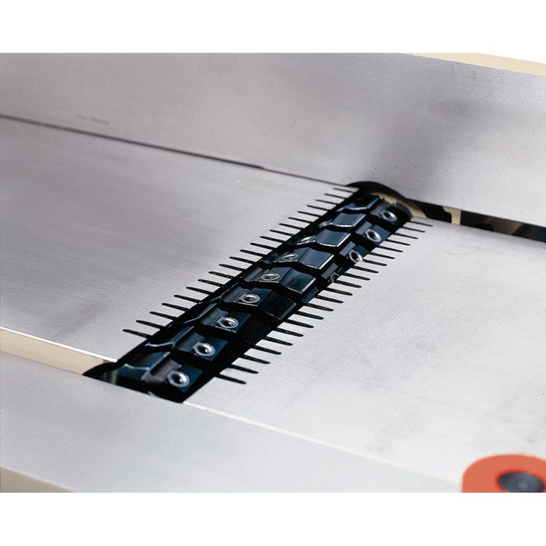 В качестве опции возможно оснащение станка ножевым валом helical, он превосходит классический практически по всем параметрам: 57 твердосплавных лезвий размером 30х12 мм расположены в несколько рядов по спирали, они заходят в древесину последовательно и под углом, что обеспечивает чистое срезание сучков и отсутствие вырывов. У каждого лезвия две режущие грани, что вдвое увеличивает его ресурс.