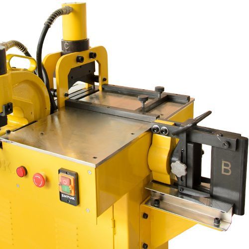 - Встроенное приспособление для центровки шины относительно вертикальной оси станка для увеличения срока его службы. Используется для резки шины (регулируемые ваймы) и для гибки (подъемная площадка);
