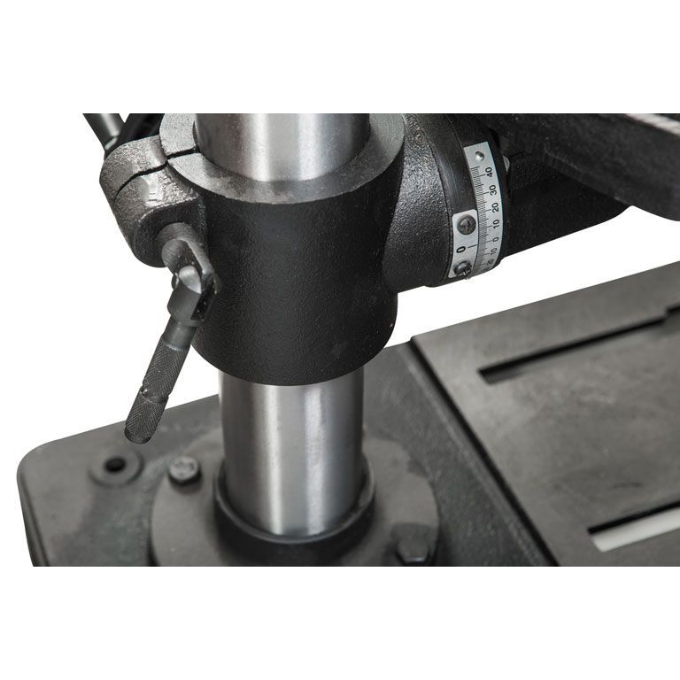 Станок укомплектован чугунным столом, регулируемым по углу установки и по высоте; реечный механизм с вращающейся рукояткой облегчает перемещение по вертикали. Сверлильная часть выполнена литой из чугуна. Для контроля глубины сверления предусмотрена шкала с миллиметровой и дюймовой разметкой, а также регулируемый ограничитель. Стандартная комплектация включает в себя удобный быстрозажимной патрон и станочные тиски для фиксации заготовок.